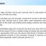 [drop2]Now their Q2 FY2011 financial report, covering the period from 1 July 2011 to 30 September 2011, reveals that they are anticipating “the sale of the small- and medium-sized display business” and is accompanied by a more detailed statement on the steps they are taking in an effort to return their LCD TV business to profitability, realigning it “from volume expansion to establishing a stable platform for revenue growth”.The stimulus for all of this is another quarter of poor financial performance which has seen Sony record an operating loss of Â¥1.6 billion ($21 million, £13.4 million).  This is on the back of sales falling by 9.1% compared to the same quarter last year (year-on-year) a fall which Sony attributes primarily to the “unfavourable foreign exchange rates and lower LCD television sales”.