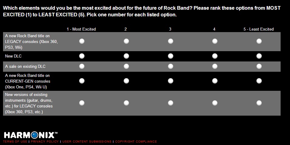 It looks like Harmonix is gearing up to start work on new Rock Band content, but to help decide what the studio should focus on a survey has been released so fans can give their input.  The survey is rather short, only containing five questions focusing on how often you play Rockband, on which platform, how much DLC has been bought, and what instruments are owned. It’s the final question that looks like it will really shape the future though.