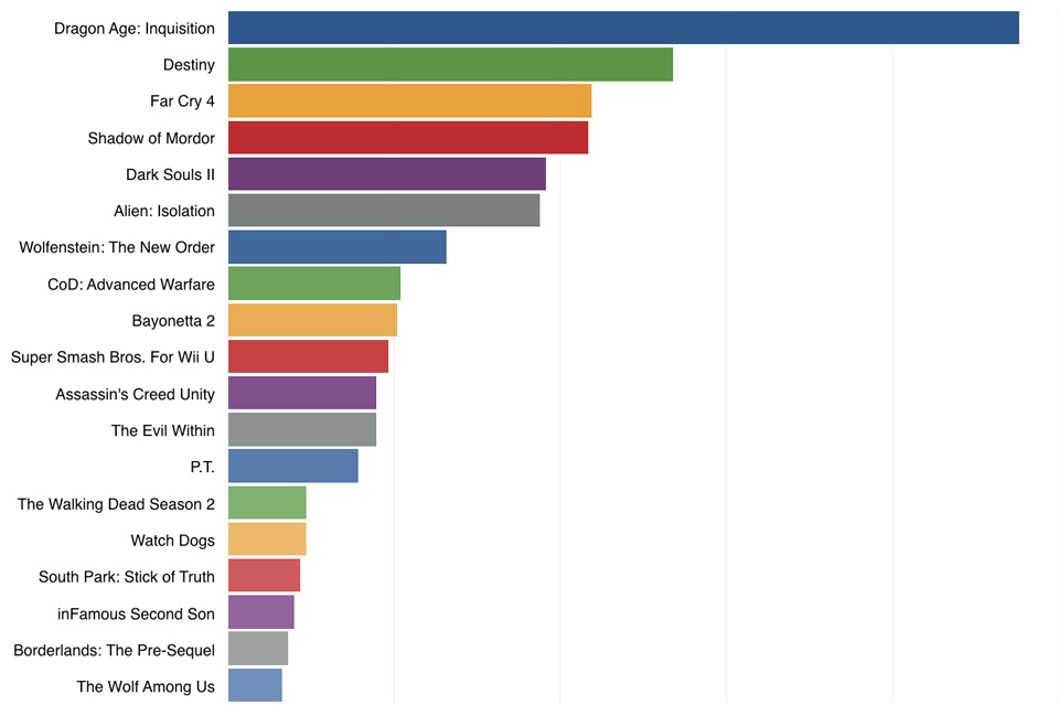 9. DA:Inquisition is a fantastic game and well deserving of the award. Dark Souls 2 was my choice but not at all disappointed or indeed surprised with the overall selection other than to notice that Mario Kart is missing from it, completely and Hearthfire is not even there with a solitary vote. Always interesting to see just how different selections are by us members of joe public.