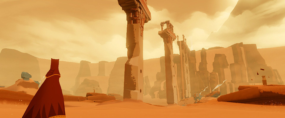Basically it’s the Hero’s Journey boiled down and rebuilt into a ludo-narratological structure. By itself it can be quite a powerful experience – in a movie, and even in most games, you have to relate to a character taking part in a story that you have no control over and little attachment to; whereas Journey, rather than taking the simple route of making the story minimalistic, goes even further and makes each part of the story connect to each stage of the Hero’s Journey. The connection between yourself and the character on the screen is thus minimised, meaning that each emotional peak and trough in the game strikes all the more profoundly.