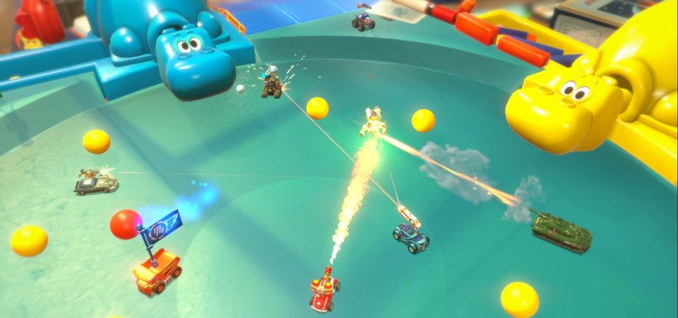 Going hands on with a nice selection of the game’s available modes, we went back and forth between online and offline play. There’s Elimination, Free-for-All and standard races, all of with were fidgety, fast-paced, but short games, place across a number of creatively designed tracks. Beyond Micro Machines, some of these tracks contain other Hasbro toys and references, from Hungry Hungry Hippos to GI Joe, giving the game a consistent playroom feeling.