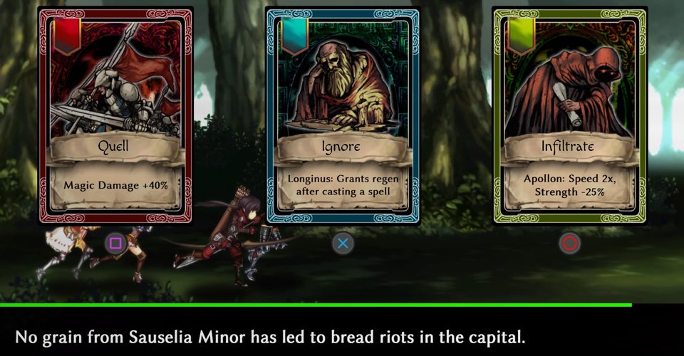 A lot of Fallen Legion is similarly half-baked and the most egregious examples come from the gameplay. Fallen Legion is a bit like Valkyrie Profile or Indivisible crossed with Oregon Trail. You pick a level from a worldmap, and then see your characters run through the stage, encountering random events or enemies. Battles have each of your four characters assigned to a face-button, and let you act at any time, as long as a character has at least one action point. Chaining together attacks and building up to special moves is fun and satisfying, especially when you get good at it and keep your combos going indefinitely.