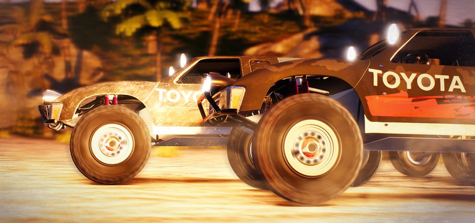 As you’d expect from an arcade racer, there’s plenty of driver assists in the game to smooth things out and the ability to rewind time around 5 seconds, which is a boon when off road racing is inherently bouncy and can be difficult to control. You can turn those assists down or off to get at the core handling model, and you can even tweak a car’s ride height, camber, and so on, if you want to mess around with the simulation. It’s an enjoyable handling model if a bit too loose and floaty, though you would expect this when off-roading, and without much distinction between contrasting surfaces. Turn assists down and you can find a tricky racer here if you want one.