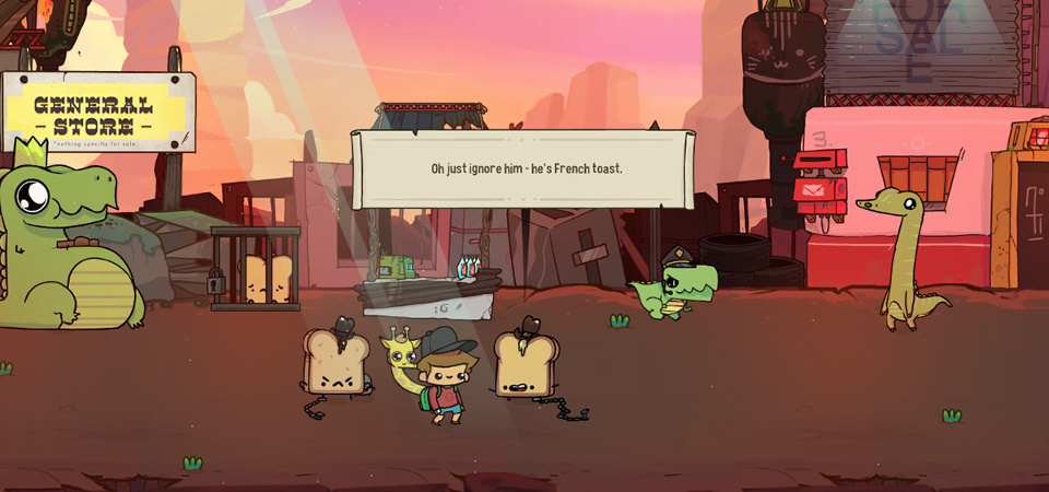 That plot is like the stand-up routine of Eddie Izzard brought to life. Evil bee-flying megalomaniac Mr B is turning people into hotdogs. He just kidnapped Wilton’s father, and now the abandoned boy is on a mission to get daddy back. On the way he’ll meet pant wearing whales, lead an uprising of sentient bread against their dinosaur overlords, and fight a boss made entirely from bits of cooked breakfast. It’s as supremely bonkers as it sounds and yet the script is tight enough – and funny enough – to bring this disparate game world together.
