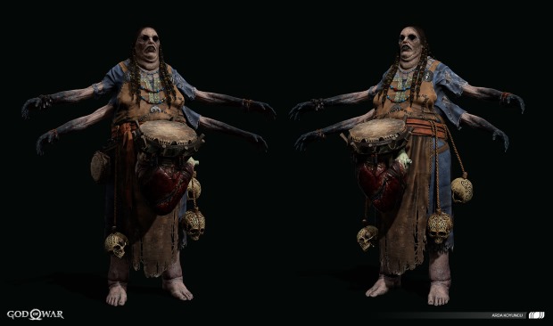 This delightful chap, known as The Drummer, was cut from the recent God of War game. He was created by Arda Koyuncu, a senior character artist at Sony Santa Monica.