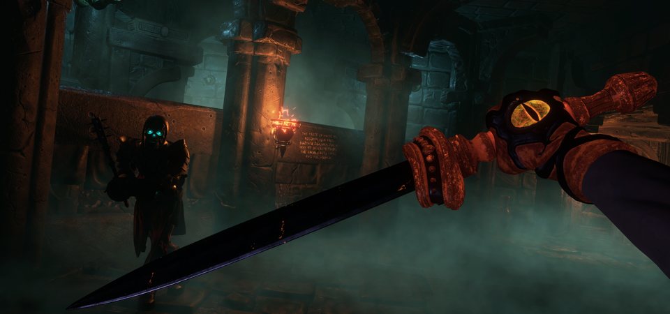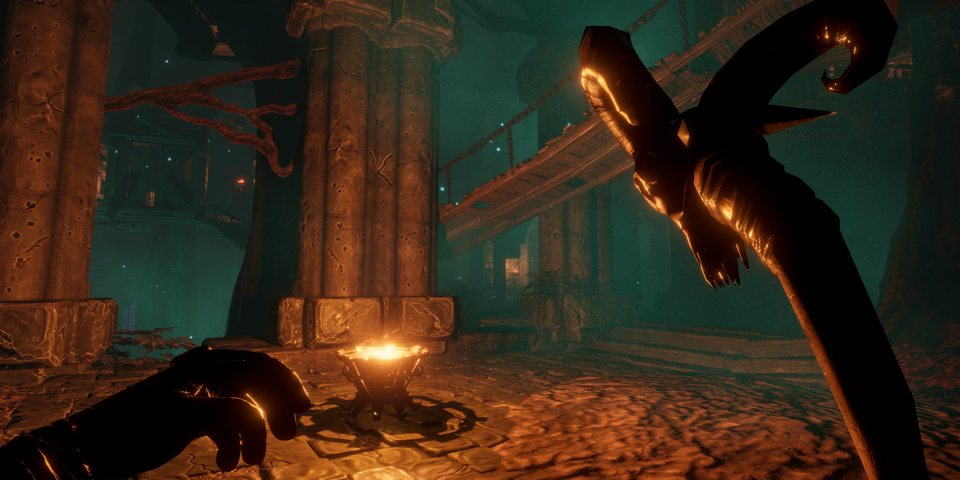 While these three paths can naturally be improved as you level up – at the end of each area, the game awards Memora points toward your skills depending on how you approached the level – you also have a fourth category of using the environment to your advantage. My natural tomfoolery in the game actually paid dividends, as I found a room with a brazier and started picking up wooden items and chucking them on top. I was actually a little surprised, first by how the objects have a physical weight that affects how you can move them, and then to see that they’d actually catch fire. These environmental interactions can be used to overcome some of the game’s puzzles, setting crates alight and then placing them next to wooden doors so that they then catch fire as well.