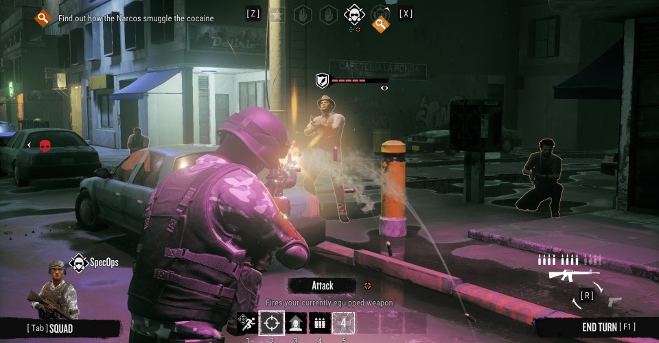 You deploy a squad of up to five units to tackle each scenario, and there are conveniently five different classes are  the same for both sides, just named differently. The Police/Lookout is the weakest unit armed with only a pistol but offers support to the other units. Search Bloc/Enforcer units are armed with submachine guns that can spray bullets to deal damage to multiple enemy units, while Spec Ops/Mercenary units have machine guns that deal damage to one enemy. DEA/Sicario units are armed with shotguns for close combat, and Demolition/Specialist units are tank characters armed with explosives.