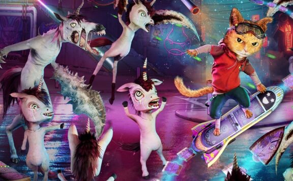 This third-person hack & slash has your adorable cat riding around on a hoverboard named F.R.A.N.K., which has been embedded with a depressed AI called CH1-P, while battling cuddly, yet horrible toys.