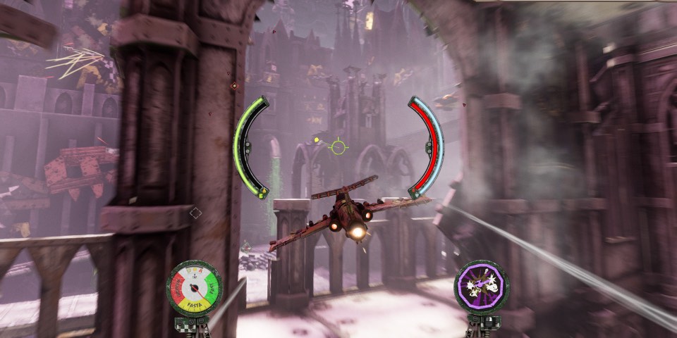 That’s not saying self preservation or skilled flying isn’t a concern, mainly thanks to some incredibly busy maps that feel like a 3D love letter to the setting. While a few early game upgrades basically nullify the damage from ramming enemy fighters, the techno-gothic infrastructure and hulking scrap-palaces of the 41st millennium offer up networks of obstacles to navigate. The first crash probably won’t kill you, but the second one almost certainly will.