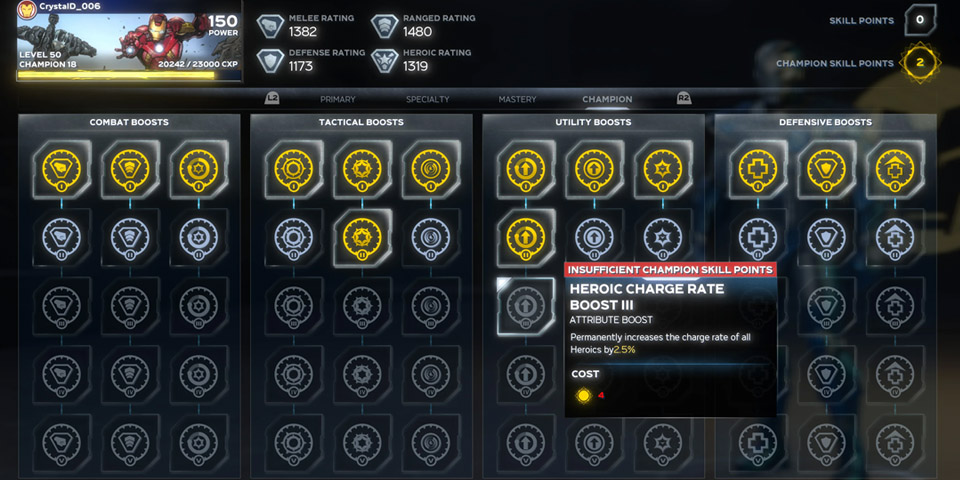 These Champion Skills exist separately from regular skills and powers with their own menu. Each hero, from Hulk to Hawkeye, each have their own unique Champion Skill sets – investing points here will raise your raw stats such as Heroic charge rate, attack damage, and perk activation chance. The end result is an extra layer of player progression, allowing you to tweak your level 50 heroes to match a certain playstyle.