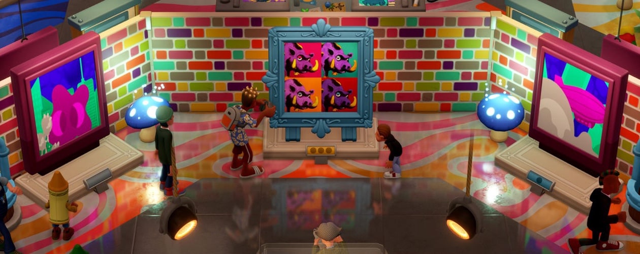 There’s much more of an artistic focus here, letting you collect, commission and display art exhibitions and installations, which can include ‘Two Point Gothic’ (American Gothic now featuring Gubbins), ‘The Persistence of Dairy’ (Dali’s Persistence of Memory with pizzas replacing clocks) and ‘Box of Truffle Pigs’ (Andy Warhol’s Monroe work re-imagined with boars). It goes beyond that with interactive experiences, which range from Performance Arts to a Sketch Show, and flinging visitors into a paint-splattering notebook..